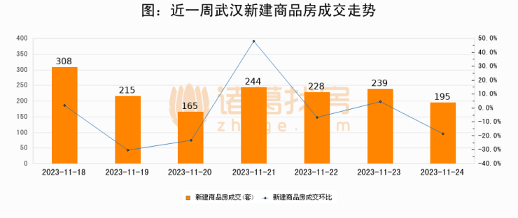 根据武汉市住房保障和房屋管理局数据显示,2023年11月24日武汉新建商品房成交195套,较昨日减少44套,环比下降18.4%