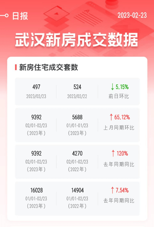 根据武汉市住房保障和房屋管理局数据显示,2023年02月23日武汉新建商品住房网签成交497套, 较昨日下降27套,环比下降5.2%。与去年同期同比上涨120%。