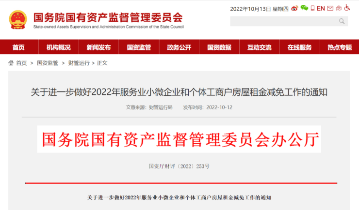 据10月13日获悉,国务院国资委日前发出《关于进一步做好2022年服务业小微企业和个体工商户房屋租金减免工作的通知》,就切实将服务业小微企业和个体工商户房屋租金减免到位做出详细安排。