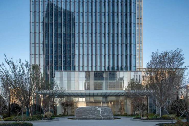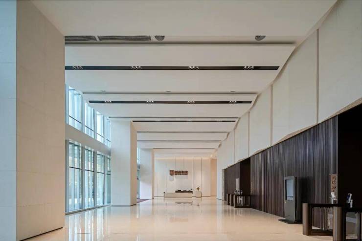 建筑入口及迎宾大堂的设计尤为引人注目,高透明度及超大面积的玻璃,形成建筑入口的第一印象,简洁通透。挑高的大堂空间和石材分割的墙面彰显出优雅大气的质感,为每一位到访者营造出独特的到达体验。