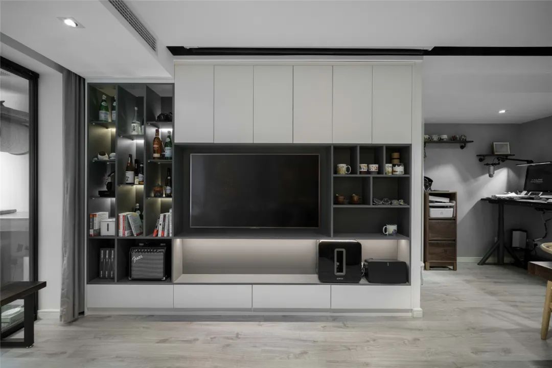 3、客厅收纳一定要做全,条件允许可以做整墙电视柜,或者添置别的收纳柜,不然你住久了真的会后悔。还有,开放格不要超过柜体面积的20%,打扫起来够你累的。