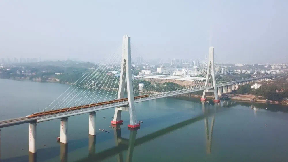 昌赣高铁赣州赣江特大桥。 大桥结构复杂技术难度大设计施工中创造出5个全国首次首次将箱形钢-混结合梁用于高速铁路大跨度斜拉桥首次运用新型钢-混结合段构造连接技术首次将索塔钢锚箱结构应用于高速铁路大跨度斜拉桥首次将锚拉板应用于高速铁路斜拉桥首次在高速铁路斜拉桥上铺设无砟轨道通车后赣州到武汉较快将仅需4小时