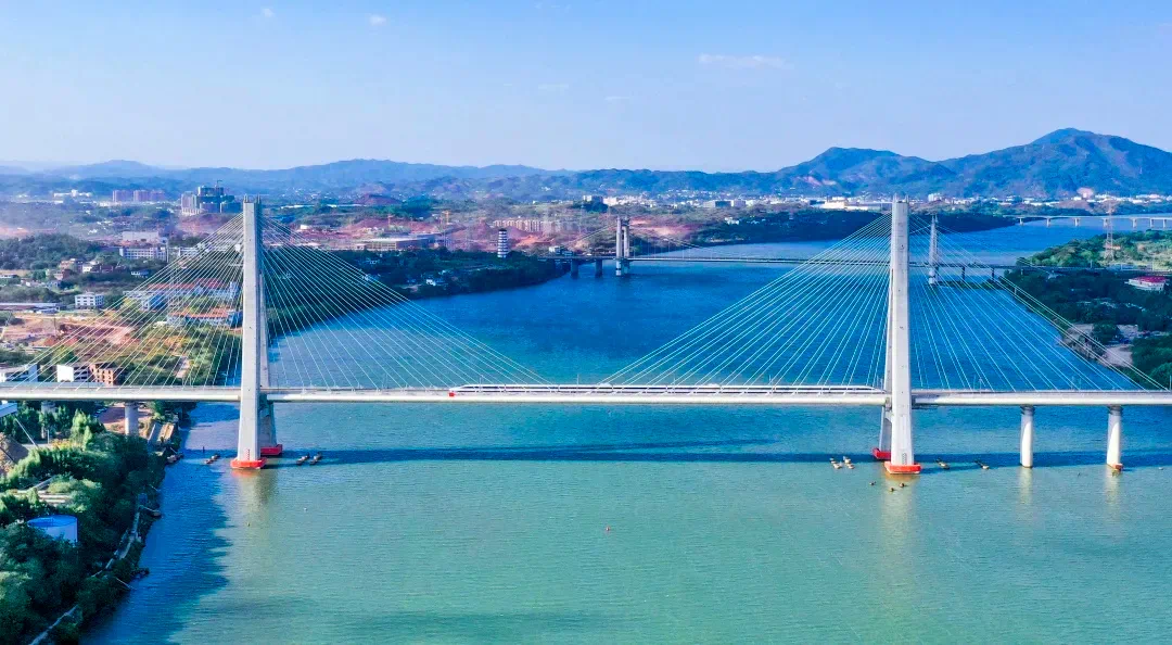 2020年4月28日由在汉央企铁四院设计的昌赣高铁赣州赣江特大桥完成铺轨大桥位于赣江支流章江贡江两江汇合口下游1.9公里处具有“水深、桩长、塔高、大跨”的特点昌赣高铁赣州赣江特大桥是国内首座设计时速350公里的大跨度高速铁路斜拉桥高铁过桥不用再减速被誉为“千里赣江排名前列桥”