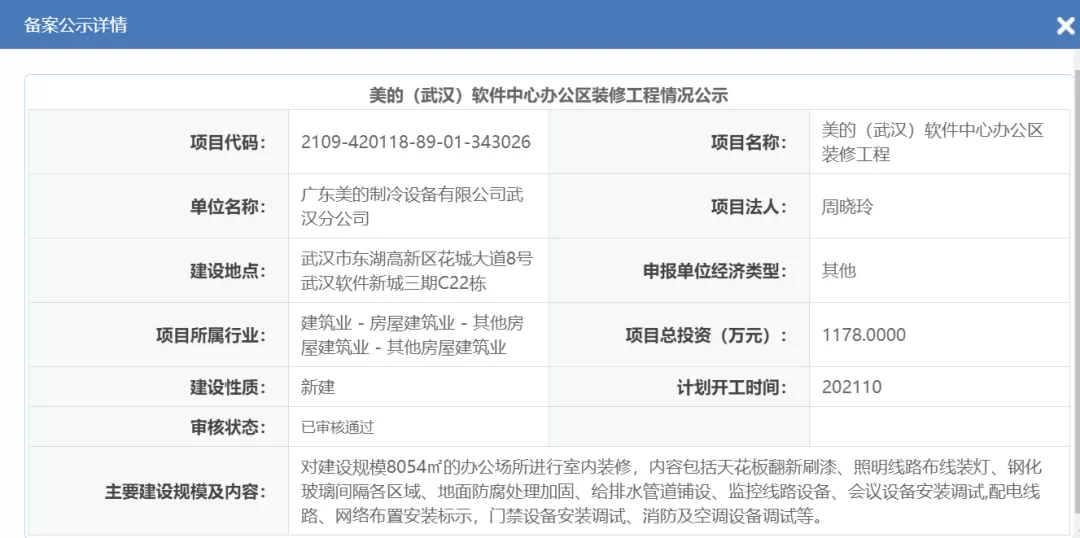 美的(武汉)软件中心办公区装修工程情况公示,标志着美的软件中心落户光谷花山。