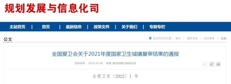 通报称,根据国家卫生城镇相关评审管理办法和标准,全国爱卫办组织专家对2021年进入复审程序的国家卫生城市(区)进行了评审,对各地上报的国家卫生乡镇(县城)复审结果进行了抽查,重新确认北京市房山区等270个城市(区)为国家卫生城市(区)。