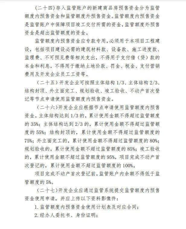 1、新建商品房预售资金,是指购房人按照商品房买卖合同约定支付的全部房价款,包括定金、首付款、分期付款、一次性付款和银行按揭贷款、住房公积金贷款等,应当全部直接交存至监管账户。