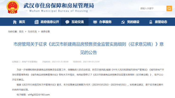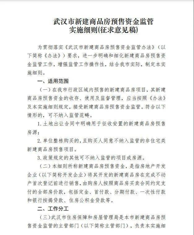 搜狐焦点“楼市快讯”报道:3月25日,武汉市住房保障和房屋管理局公示了市房管局关于征求《武汉市新建商品房预售资金监管实施细则(征求意见稿)》意见的公告。