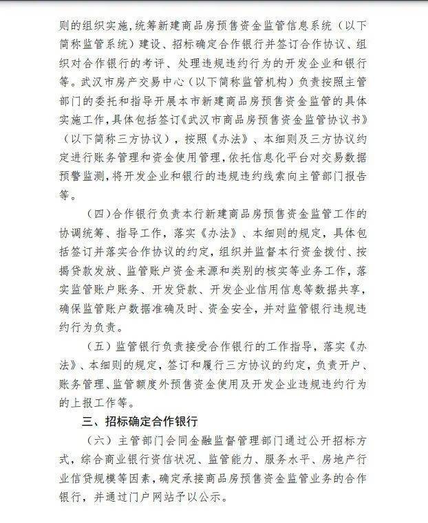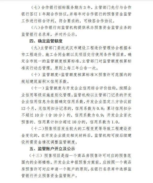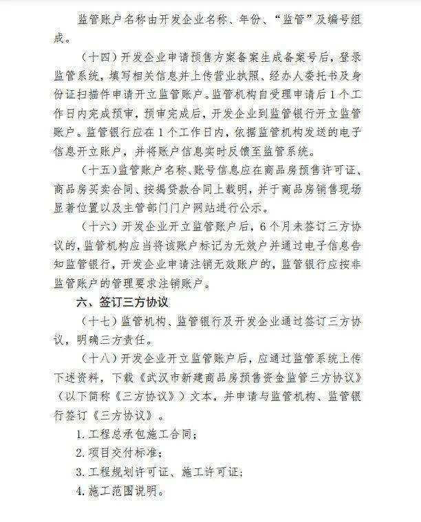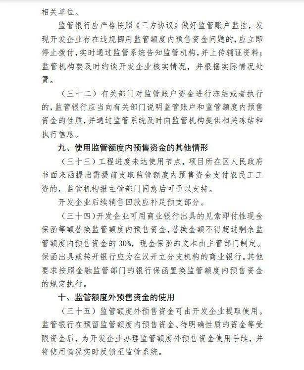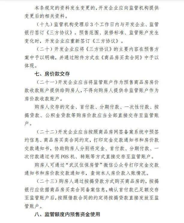 目前武汉执行的监管政策是2018年6月起施行的《武汉市新建商品房预售资金监管办法》。2022年9月,武汉市发布新建商品房预售资金监管办法(征求意见稿),新增了部分内容,进一步加强新建商品房预售资金的监督管理,确保预售资金用于商品房项目工程建设,保障购房人的合法权益。
