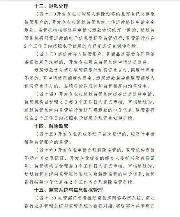 购房者发生开发企业应通过监管系统提交退房退款申请,监管机构自受理之日起 3 个工作日内完成审核,审核通过的,通过监管系统向监管银行发送同意退款的电子信息。监管银行应在2个工作日内按照电子信息办理资金划转手续。