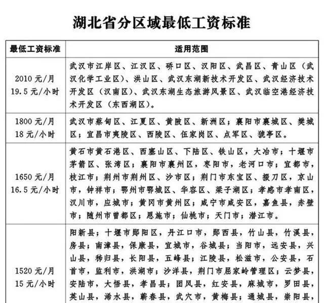 根据国家《较低工资规定》有关要求和人社部批复意见,调整过后,湖北省全日制就业劳动者月较低工资标准按区域(如图)划分为四档,依次为2010元、1800元、1650元、1520元,非全日制就业劳动者的小时较低工资标准依次为19.5元、18元、16.5元、15元。