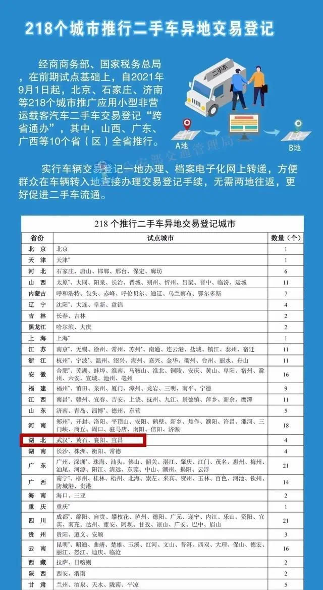 9月1日起,公安部将在全国218个城市推行二手车异地交易登记“跨省通办”,湖北省的武汉、黄石、襄阳、宜昌将如期同步推行。