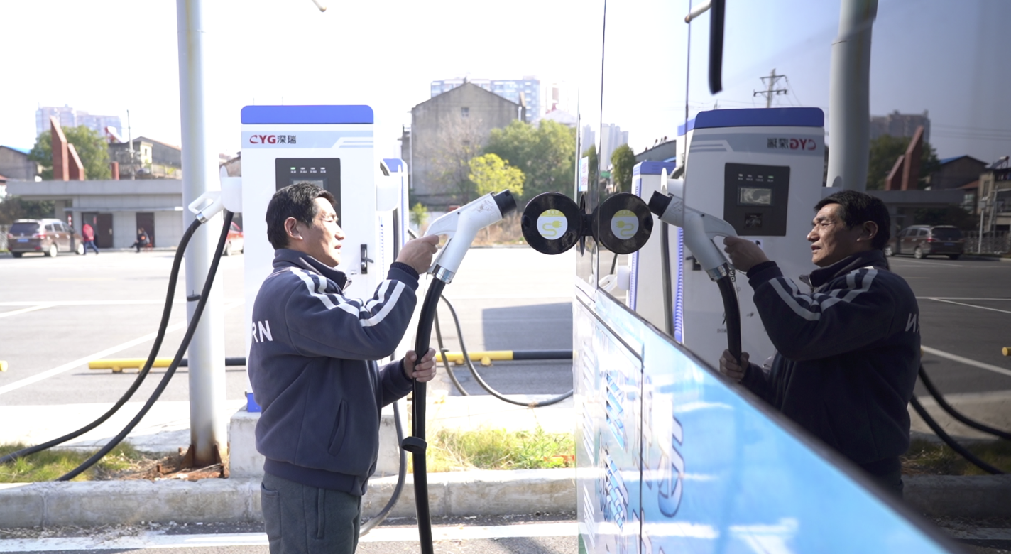 青龙村盐坊湾公交场站内,工作人员将新能源公交车充上电。