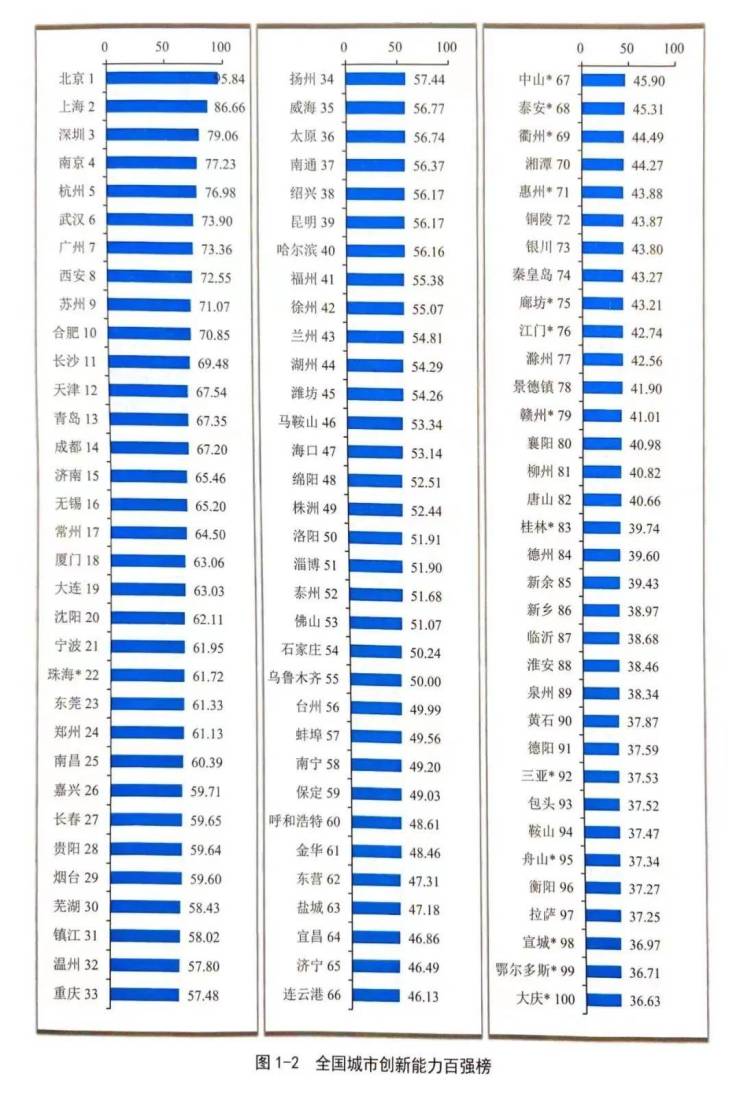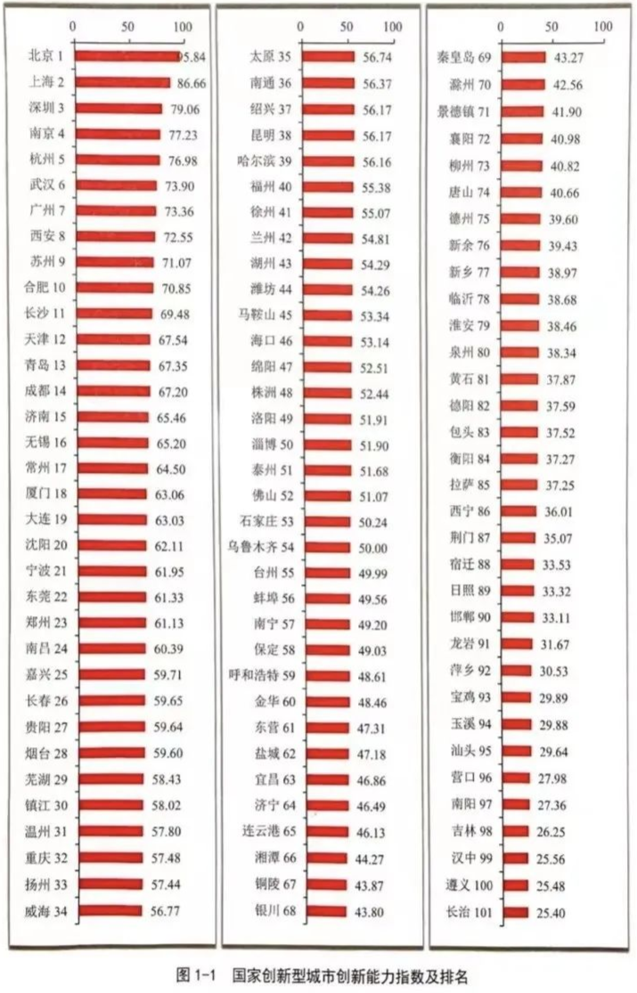 报告介绍称,国家创新型城市是指自主创新能力强、科技支撑引领作用突出、经济社会可持续发展水平高、区域辐射带动作用显著的城市,科技部每年从创新治理力、原始创新力、技术创新力、成果转化力、创新驱动力等五大维度30项指标对创新型城市进行综合评价。与往年不同,今年的报告首次将北京、上海、天津、重庆4个直辖市纳入评比,参评城市总数由97个增加至101个。