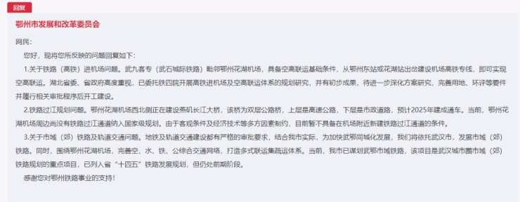 鄂州花湖机场作为亚洲排名前列座专业货运枢纽机场,它的发展与周边规划牵动着当地居民的心。近日,有网友留言对花湖机场周边与湖北鄂州市域铁路规划提出建议。