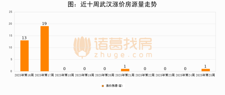 从调价房源来看,第25周武汉涨价房源1套,较上周上涨0%。与此同时,25周涨价房源占比提升100个百分点,业主信心持续恢复。