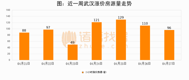 根据诸葛找房数据显示,武汉24小时涨价房源量为96套,较04月26日减少14套,环比下降12.7%。与此同时,涨价房源占比小幅回落,对于购房者来说是一个入市窗口期,购房者可抓住时机入市。