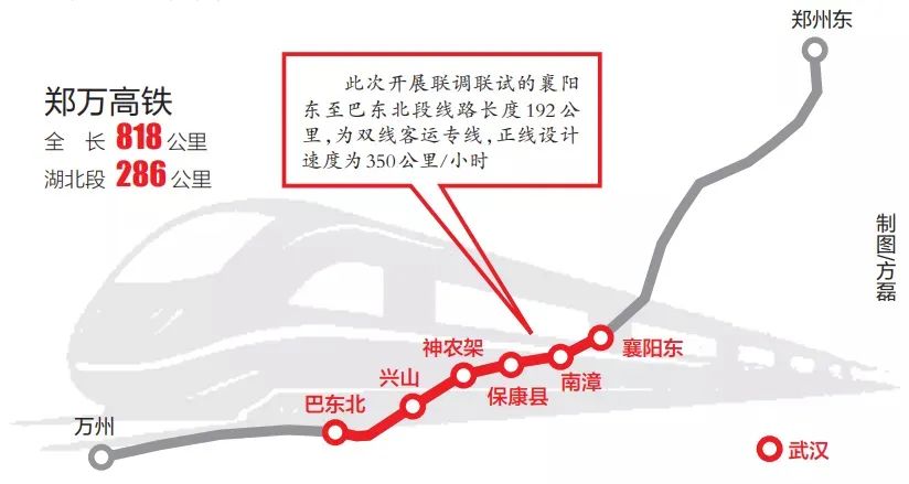 郑万高铁湖北段全长286公里,此次开展联调联试的襄阳东至巴东北段线路长度192公里,正线设计速度为350公里/小时。