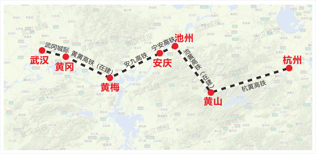 黄黄高铁开通后,武汉到九江将缩短至1小时。到安庆90分钟、到杭州仅需3小时,较以往分别压缩1个小时左右。