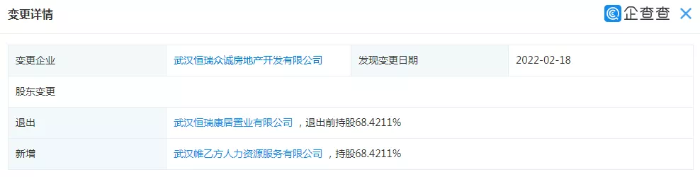 2月20日消息,搜狐焦点获悉,近日,武汉恒瑞众诚房地产开发有限公司股东发生变更。