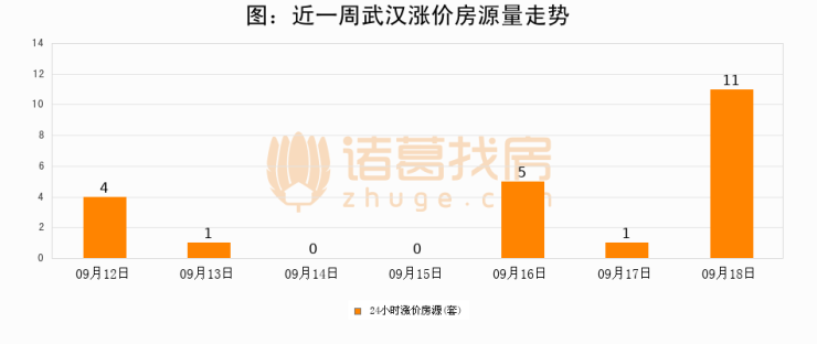 根据诸葛找房数据显示,武汉24小时涨价房源量为11套,较09月17日增加10套,环比上涨1000%。与此同时,涨价房源占比小幅扩大,业主信心有所提升。