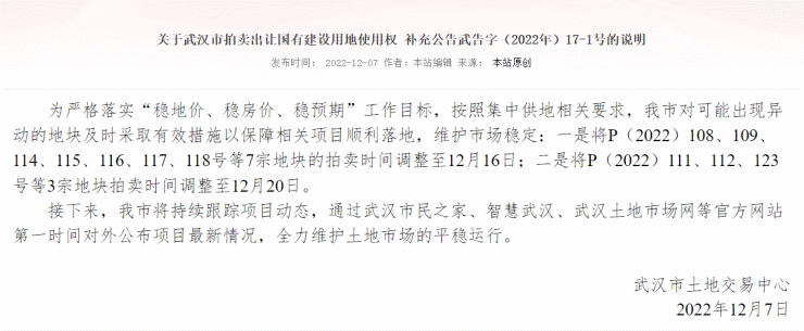 另外10块临时延期,包括杨春湖高铁商务区1-6号地块整体延期,还有之前大家高度关注的、价格腰斩的光谷地块也遭延期,月湖板块的供地也延期揭牌。官方为此特发布延期公告: