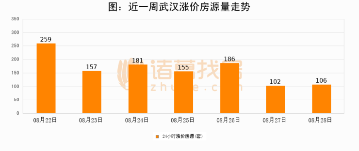 根据诸葛找房数据显示,武汉24小时涨价房源量为106套,较08月27日增加4套,环比上涨3.9%。与此同时,涨价房源占比小幅扩大,业主信心有所提升。