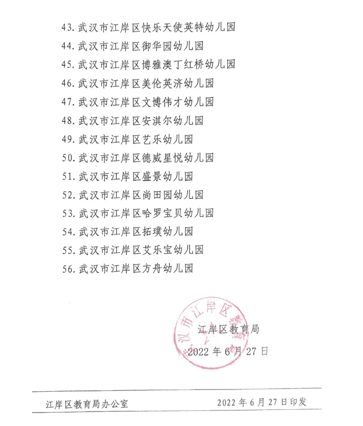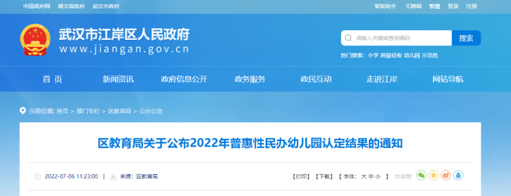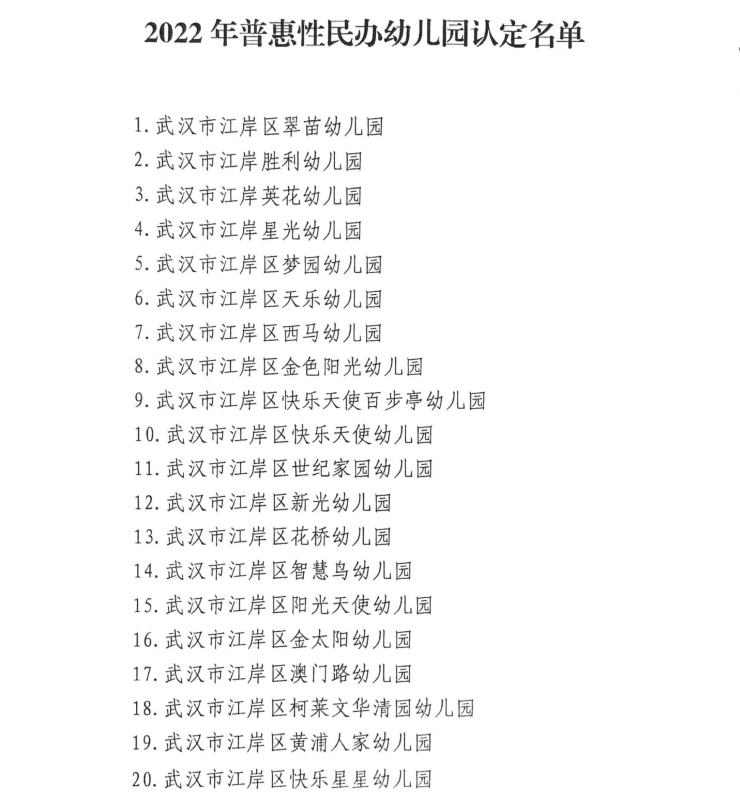 7月12日消息,搜狐焦点获悉, 日前,武汉市江岸区人民政府官网发布《区教育局关于公布2022年普惠性民办幼儿园认定结果的通知》,经幼儿园申报,江岸区教育局审核认定了56所幼儿园为普惠性民办幼儿园 ,具体名单如下: