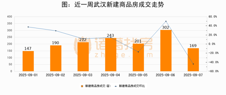 根据武汉市住房保障和房屋管理局数据显示,2025年09月07日武汉新建商品房成交169套,较昨日减少133套,环比下降44%