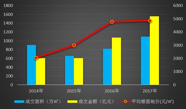 2017年武汉市共计成交土地181宗,累计成交规划建筑面积3193.8万平方米,土地面积1097.84万平方米,比去年同期增长33%,累计成交金额达1555.24亿元,比去年同期增长45%。全年楼面均价约4870元/㎡,基本与2016年持平。