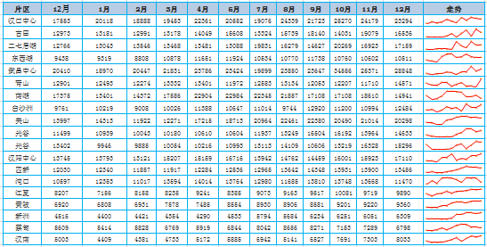 商铺成交中,有三个区表现比较抢眼,均超过2000套,其中东西湖区成交3649套,经济开发区成交3340套,江岸区成交2258套。有五个区年度成交额不足千套,分别是青山区成交995套,武昌区成交991套,硚口区成交690套,汉南区依然垫底成交622套。