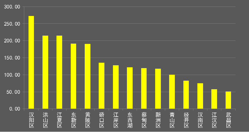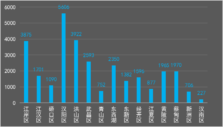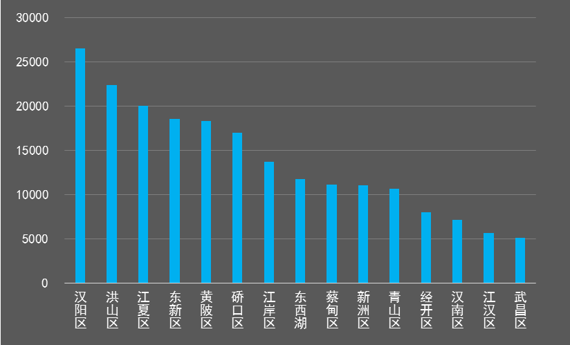 从成交地块数量上来看,黄陂区以22宗的成交量蝉联全市排名前列,其次为洪山区(19)、蔡甸区(18)、东湖新技术开发区(18)、东西湖区(18);汉南区一改2016年全年无成交的尴尬地位,共成交6宗。硚口区全年仅有3宗地成交,为全市较低。