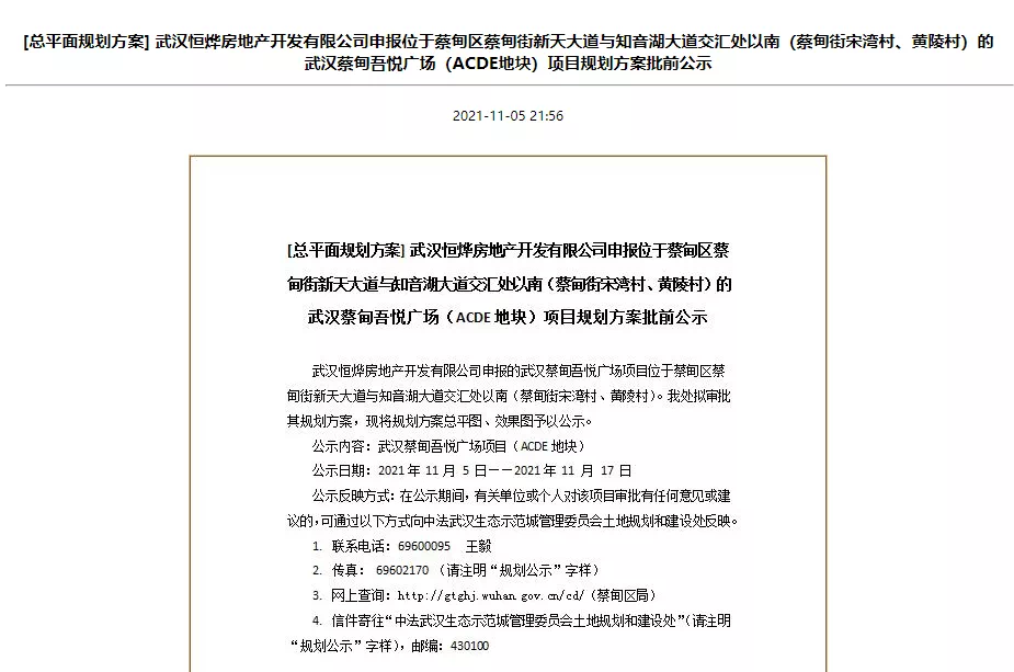 11月11日消息,搜狐焦点获悉,11月5日,武汉恒烨房地产开发有限公司申报武汉蔡甸吾悦广场(ACDE地块)项目规划方案批前公示,具体批示方案如下。