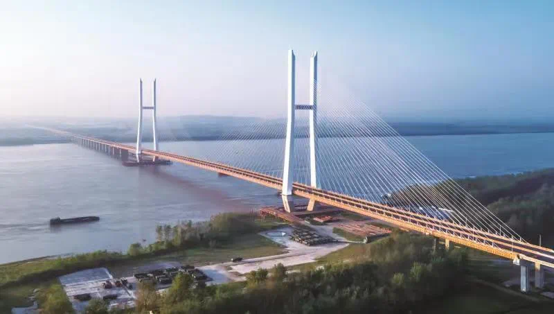 主桥长1380米,全线采用双向六车道一级公路标准建设,设计时速100公里,采用主跨720米的钢混结合梁斜拉桥方案,通车后将成为随岳、沪渝、汉洪监、京港澳、武深、杭瑞等高速公路的重要节点。