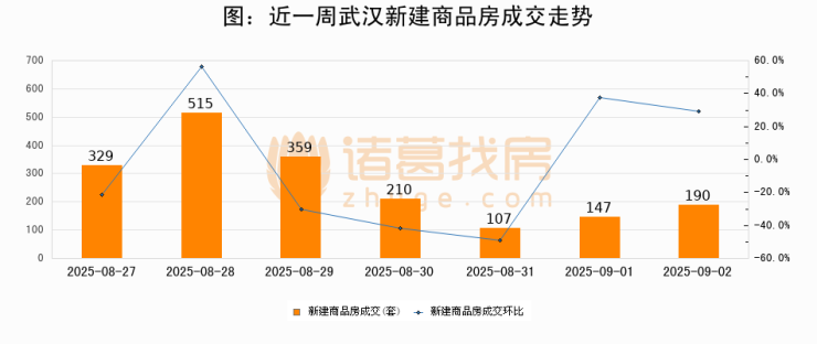 根据武汉市住房保障和房屋管理局数据显示,2025年09月02日武汉新建商品房成交190套,较昨日增加43套,环比上涨29.2%