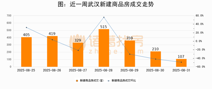 根据武汉市住房保障和房屋管理局数据显示,2025年08月31日武汉新建商品房成交107套,较昨日减少103套,环比下降49%