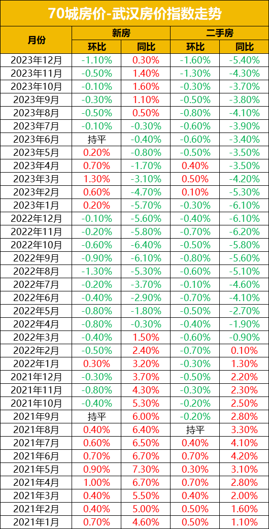 其中,武汉新房价格环比下降1.1%,同比上涨0.3%;二手房价格环比下降1.6%,同比下降5.4%。