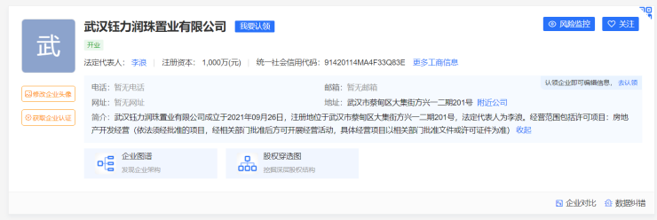 据天眼查App显示,9月26日,武汉钰力润珠置业有限公司成立,注册资本1000万元人民币,法定代表人为李浪,经营范围含房地产开发经营。股东信息显示,该公司由格力暖通制冷设备(武汉)有限公司和武汉钰源置业有限公司共同持股,持股比例分别为70%、30%。
