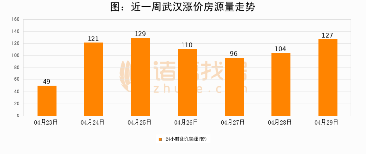 根据诸葛找房数据显示,武汉24小时涨价房源量为127套,较04月28日增加23套,环比上涨22.1%。与此同时,涨价房源占比小幅扩大,业主信心有所提升。