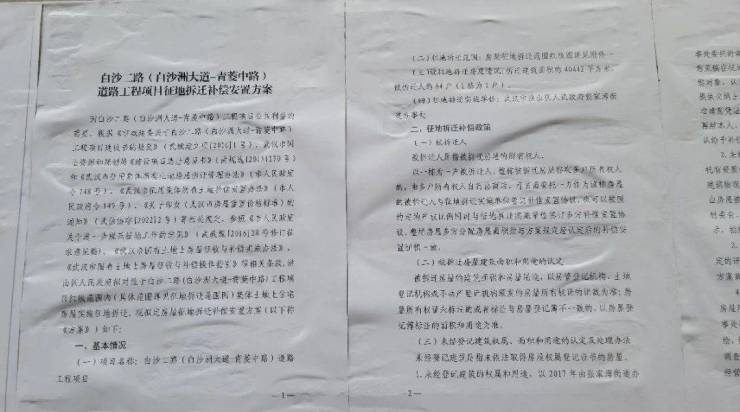 去年4月,白沙二路(白沙洲大道-青菱中路)道路工程项目征地拆迁补偿安置方案(征求意见稿)发布。对拆迁补偿方案进行近一年的讨论后,今年3月初,洪山区城区改造更新局发布2份公告,并在白沙洲长征村进行了张贴。白沙二路长征村征地拆迁补偿安置方案最终确定,拆迁即将开启。