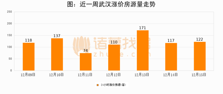 根据诸葛找房数据显示,武汉24小时涨价房源量为122套,较12月14日增加5套,环比上涨4.3%。与此同时,涨价房源占比小幅扩大,业主信心有所提升。