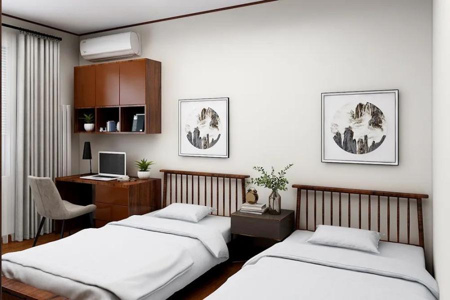 对于两个次卧分别设计了老人房和儿童房,老人房中主要是以舒适简约作为主要的设计重点,充分考虑到老人年因因素,色彩搭配深浅有度,床的一侧放置书桌,别致而优雅,另一侧放置衣柜,方便日常换置,舒适感倍增。