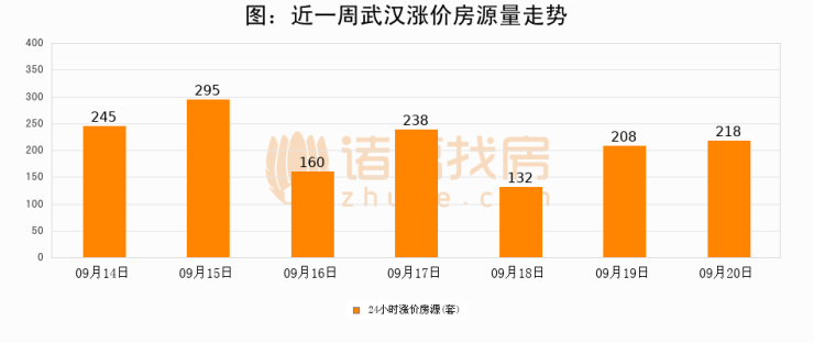根据诸葛找房数据显示,武汉24小时涨价房源量为218套,较09月19日增加10套,环比上涨4.8%。与此同时,涨价房源占比小幅扩大,业主信心有所提升。