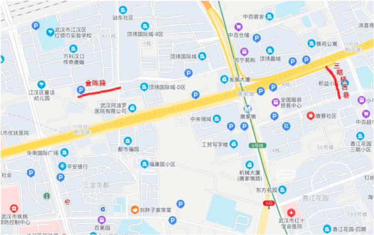 位于江汉区唐家墩街道辖区,大致南北走向。南起唐蔡路,北至发展大道止,全长约100米,宽约3米,水泥路面。因该路位于三眼桥西侧,故名。