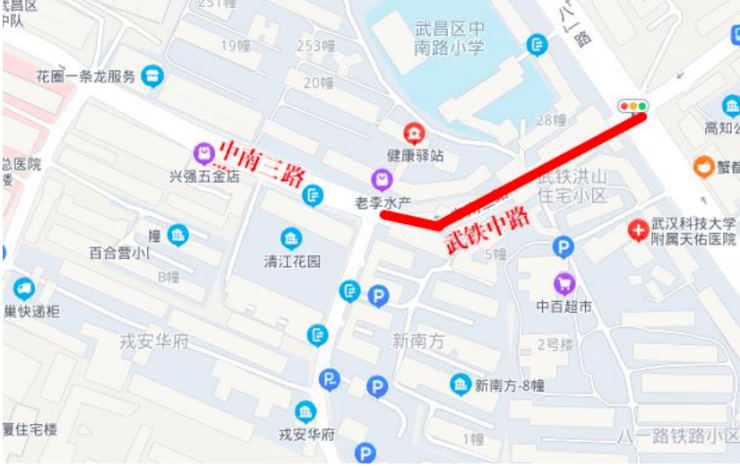位于武昌区水果湖街道辖区。大致东西走向。西起中南三路清江花园路口,东至八一路止,全长约190米,宽18米。因该路穿越武铁洪山住宅小区中间,故名。