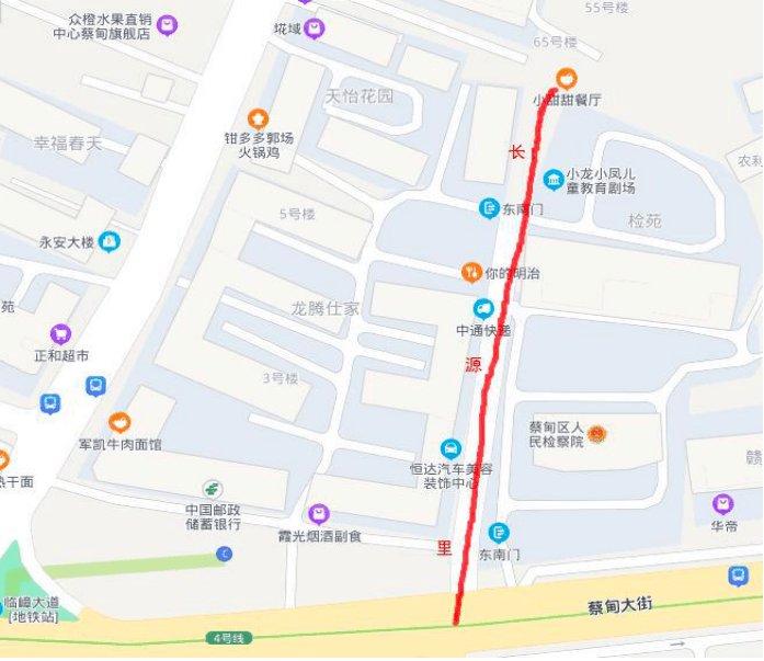 位于蔡甸区蔡甸街道辖区,地处检苑小区与龙腾仕家小区之间。大致南北走向,南起蔡甸大街,北至长喜里65号,全长约500米,宽约6米,水泥路面。因该路位于茂源社区和长喜里,故名。