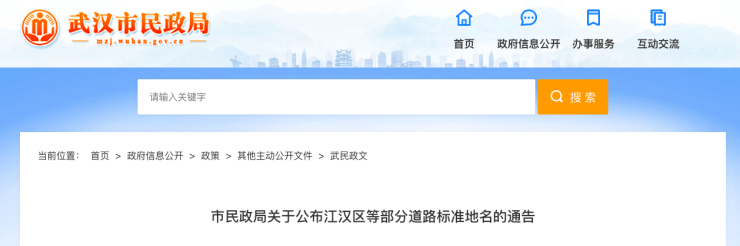 12月30日消息,搜狐焦点获悉,兴文路、恒雅路……武汉市民政局日前发通告,公布了我市部分道路标准地名,其中,江汉区6条,武昌区3条,蔡甸区、新洲区各1条。此外,武汉经济技术开发区有2条道路地名书写用字有调整。