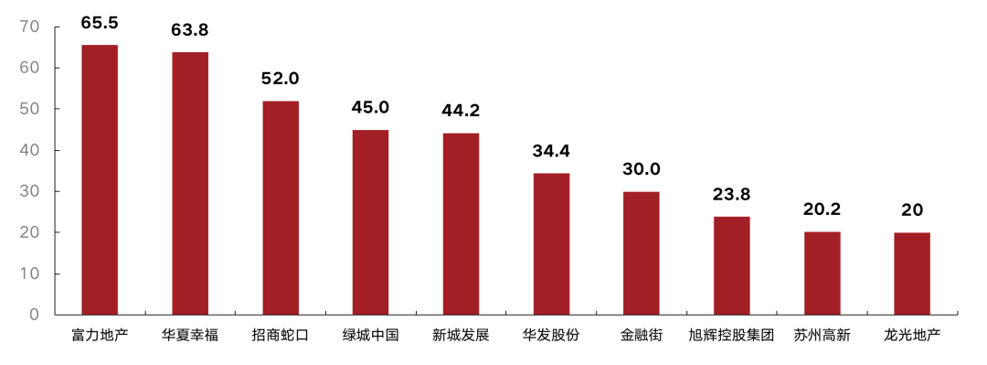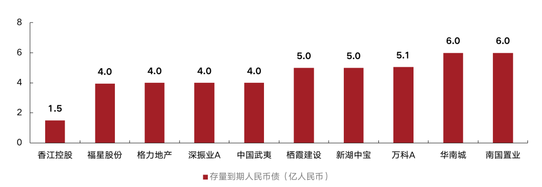 从人民币债的到期情况来看,富力地产与华夏幸福到期规模不相上下,分别为65.5亿元及63.8亿元,排名前二。