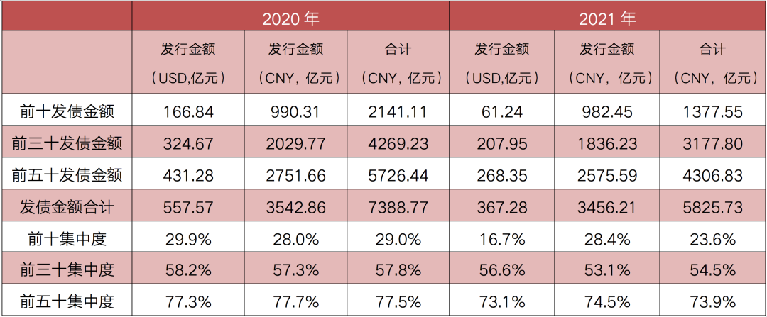 从发债集中度来看,2021年全年发债金额较2020年同比下降21.2%,其中,前十发债金额下降比例较大,为35.7%。