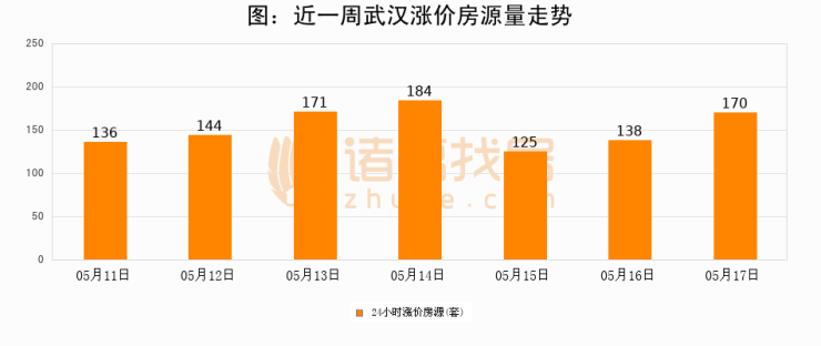 根据诸葛找房数据显示,武汉24小时涨价房源量为170套,较05月16日增加32套,环比上涨23.2%。与此同时,涨价房源占比小幅扩大,业主信心有所提升。