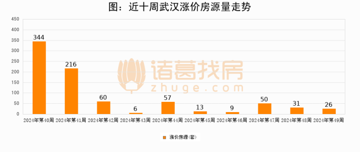 从调价房源来看,第49周武汉涨价房源26套,较上周下降16.1%。与此同时,49周涨价房源占比回落0.72个百分点,业主信心小幅波动,购房者可则需入市。
